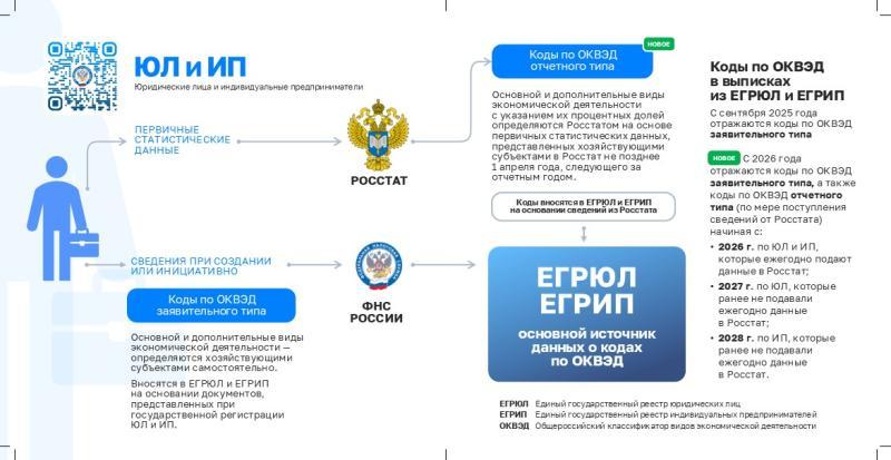 В реестрах ЕГРЮЛ и ЕГРИП теперь содержатся два типа кодов по ОКВЭД: заявительные и отчетные. Первые определяются хозяйствующим субъектом самостоятельно и вносятся в ЕГРЮЛ и ЕГРИП в соответствии с документами, представленными при государственной регистрации. Они отражаются в выписках из ЕГРЮЛ и ЕГРИП с сентября 2025 года.